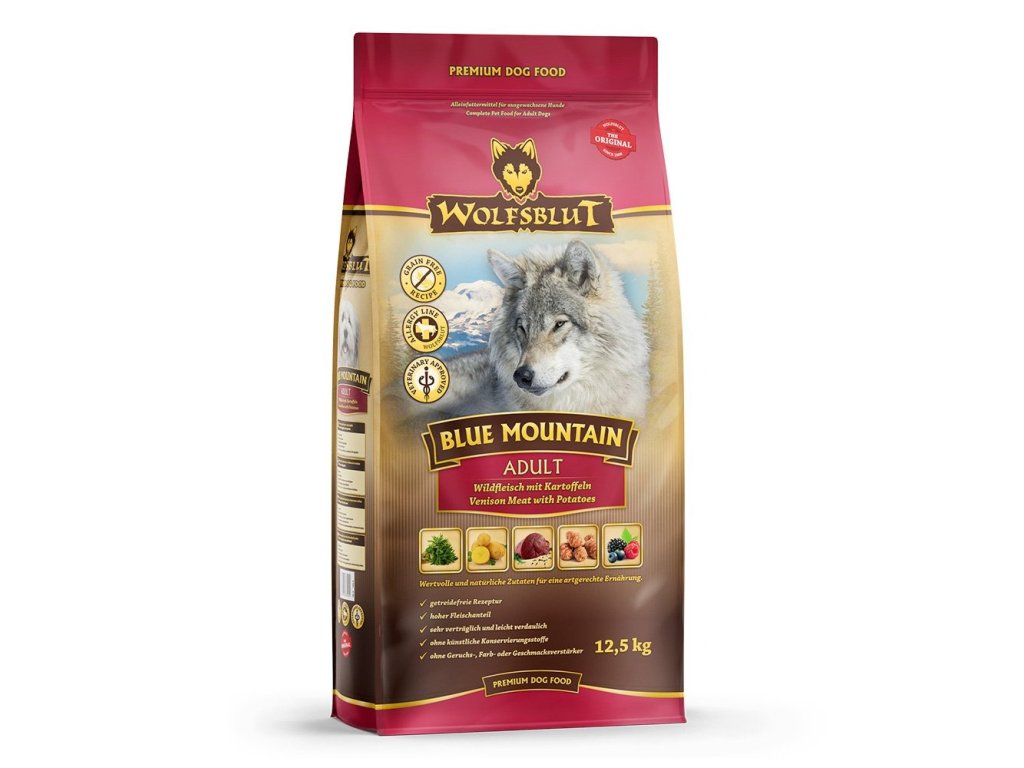 Vlci loví svou kořist od Skalistých hor Severní Ameriky, arktické tundry, hor a lesů Evropy až po pouště a stepi střední Asie. To jim dodává maso a vnitřnosti bohaté na živiny, ale také zeleninu, ovoce, bobule, kořeny a bylinky z obsahu žaludku kořisti. Obilí zde není zahrnuto. Vlk tak přijímá potřebné vitamíny, minerály, stopové prvky, enzymy a druhotné rostlinné látky. Vzhledem k tomu, že vlk je předkem všech psů, naše suché krmivo pro psy Wolfsblut je založeno na přirozených stravovacích návycích vlka. Obsahuje hodně masa nebo ryb v kombinaci se superpotravinami, které obsahují hodnotné ingredience – stejně jako v přírodě, bez obilovin. Náš výběr výjimečných druhů masa a superpotravin bohatých na živiny vychází z vlčích biotopů a jejich pestré stravy. Wolfsblut nabízí každému psovi druhově vhodnou a originální stravu a díky rozmanitosti odrůd si každý najde něco, co snese. Receptura suchého krmiva BLUE MOUNTAIN kombinuje výživu vlků s nejnovějšími vědeckými poznatky o správné výživě psů.