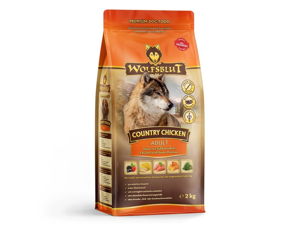 Vlci loví svou kořist od Skalistých hor Severní Ameriky, arktické tundry, hor a lesů Evropy až po pouště a stepi střední Asie. To jim dodává maso a vnitřnosti bohaté na živiny, ale také zeleninu, ovoce, bobule, kořeny a bylinky z obsahu žaludku kořisti. Obilí zde není zahrnuto. Vlk tak přijímá potřebné vitamíny, minerály, stopové prvky, enzymy a druhotné rostlinné látky. Vzhledem k tomu, že vlk je předkem všech psů, naše suché krmivo pro psy Wolfsblut je založeno na přirozených stravovacích návycích vlka. Obsahuje hodně masa nebo ryb v kombinaci se superpotravinami, které obsahují hodnotné ingredience – stejně jako v přírodě, bez obilovin. Náš výběr výjimečných druhů masa a superpotravin bohatých na živiny vychází z vlčích biotopů a jejich pestré stravy. Wolfsblut nabízí každému psovi druhově vhodnou a originální stravu a díky rozmanitosti odrůd si každý najde něco, co snese. Receptura suchého krmiva COUNTRY CHICKEN ADULT kombinuje výživu vlků s nejnovějšími vědeckými poznatky o správné výživě psů.
