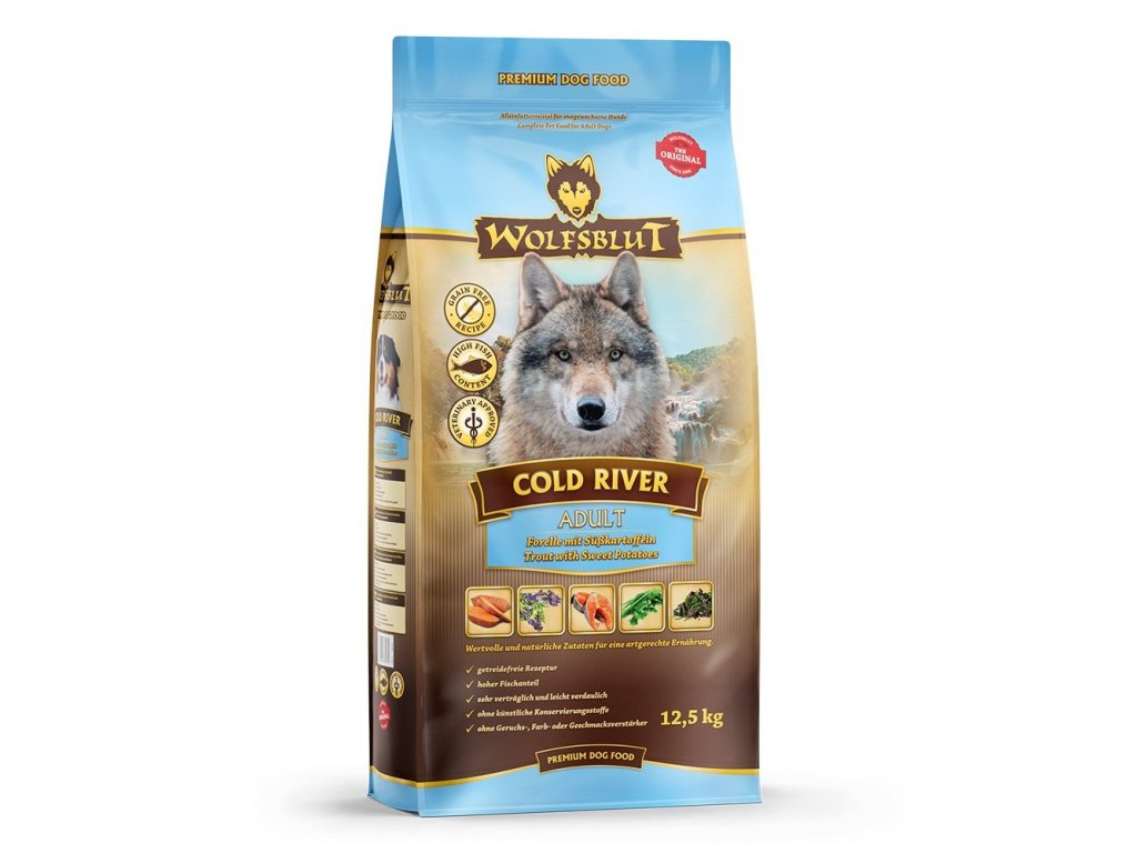 Vlci loví svou kořist od Skalistých hor Severní Ameriky, arktické tundry, hor, lesů a řek Evropy až po pouště a stepi střední Asie. To jim dodává maso a ryby a vnitřnosti bohaté na živiny, ale také zeleninu, ovoce, bobule, kořeny a bylinky prostřednictvím obsahu žaludku kořisti. Obilí zde není zahrnuto. Vlk tak přijímá potřebné vitamíny, minerály, stopové prvky, enzymy a druhotné rostlinné látky. Vzhledem k tomu, že vlk je předkem všech psů, naše suché krmivo pro psy Wolfsblut je založeno na přirozených stravovacích návycích vlka. Obsahuje hodně masa nebo ryb v kombinaci se superpotravinami, které obsahují hodnotné ingredience – stejně jako v přírodě, bez obilovin. Náš výběr výjimečných druhů masa a superpotravin bohatých na živiny vychází z vlčích biotopů a jejich pestré stravy. Wolfsblut nabízí každému psovi druhově vhodnou a originální stravu a díky rozmanitosti odrůd si každý najde něco, co snese. Receptura suchého krmiva COLD RIVER kombinuje výživu vlků s nejnovějšími vědeckými poznatky o správné výživě psů.