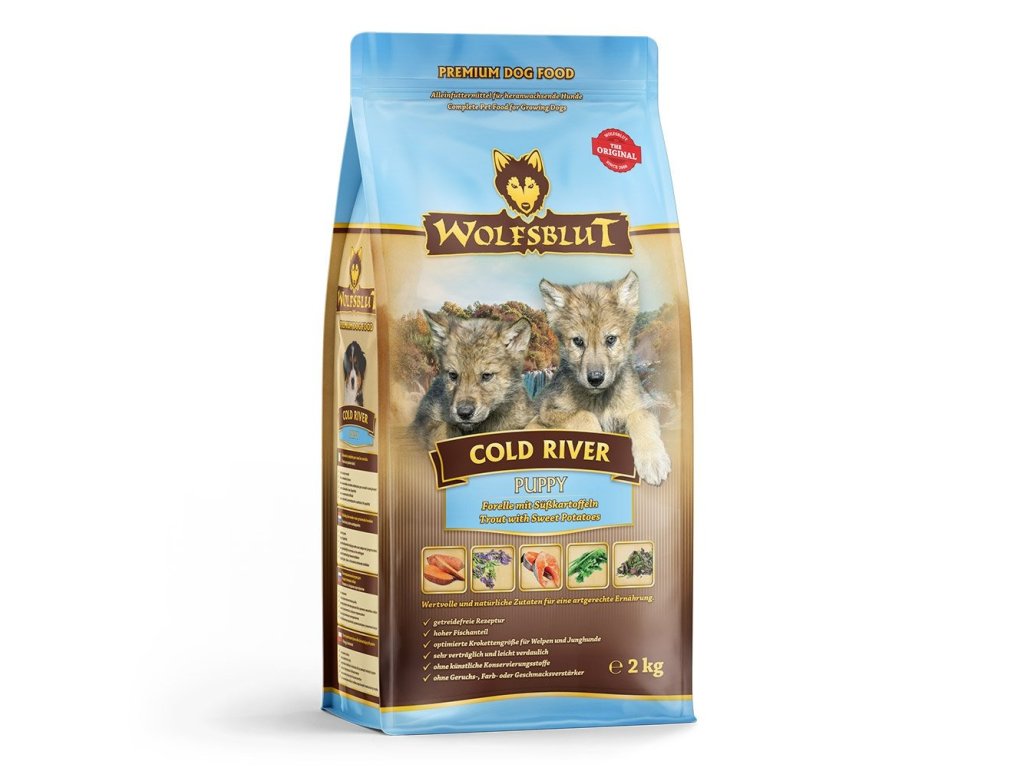Vlci loví svou kořist od Skalistých hor Severní Ameriky, arktické tundry, hor a lesů Evropy až po pouště a stepi střední Asie. To jim dodává maso a vnitřnosti bohaté na živiny, ale také zeleninu, ovoce, bobule, kořeny a bylinky z obsahu žaludku kořisti. Obilí zde není zahrnuto. Vlk tak přijímá potřebné vitamíny, minerály, stopové prvky, enzymy a druhotné rostlinné látky. Vzhledem k tomu, že vlk je předkem všech psů, naše suché krmivo pro psy Wolfsblut je založeno na přirozených stravovacích návycích vlka. Obsahuje hodně masa nebo ryb v kombinaci se superpotravinami, které obsahují hodnotné ingredience – stejně jako v přírodě, bez obilovin. Náš výběr výjimečných druhů masa a superpotravin bohatých na živiny vychází z vlčích biotopů a jejich pestré stravy. Wolfsblut nabízí každému psovi druhově vhodnou a originální stravu a díky rozmanitosti odrůd si každý najde něco, co snese. Receptura suchého krmiva COLD RIVER PUPPY kombinuje výživu vlků s nejnovějšími vědeckými poznatky o správné výživě psů.
