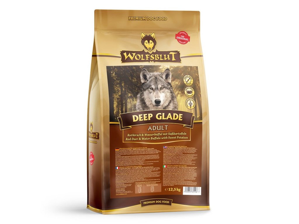 Vlci loví svou kořist od Skalistých hor Severní Ameriky, arktické tundry, hor a lesů Evropy až po pouště a stepi střední Asie. To jim dodává maso a vnitřnosti bohaté na živiny, ale také zeleninu, ovoce, bobule, kořeny a bylinky z obsahu žaludku kořisti. Obilí zde není zahrnuto. Vlk tak přijímá potřebné vitamíny, minerály, stopové prvky, enzymy a druhotné rostlinné látky. Vzhledem k tomu, že vlk je předkem všech psů, naše suché krmivo pro psy Wolfsblut je založeno na přirozených stravovacích návycích vlka. Obsahuje hodně masa nebo ryb v kombinaci se superpotravinami, které obsahují hodnotné ingredience – stejně jako v přírodě, bez obilovin. Náš výběr výjimečných druhů masa a superpotravin bohatých na živiny vychází z vlčích biotopů a jejich pestré stravy. Wolfsblut nabízí každému psovi druhově vhodnou a originální stravu a díky rozmanitosti odrůd si každý najde něco, co snese. Receptura suchého krmiva DEEP GLADE ADULT kombinuje výživu vlků s nejnovějšími vědeckými poznatky o správné výživě psů.