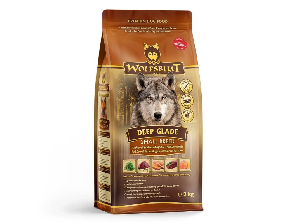 Vlci loví svou kořist od Skalistých hor Severní Ameriky, arktické tundry, hor a lesů Evropy až po pouště a stepi střední Asie. To jim dodává maso a vnitřnosti bohaté na živiny, ale také zeleninu, ovoce, bobule, kořeny a bylinky z obsahu žaludku kořisti. Obilí zde není zahrnuto. Vlk tak přijímá potřebné vitamíny, minerály, stopové prvky, enzymy a druhotné rostlinné látky. Vzhledem k tomu, že vlk je předkem všech psů, naše suché krmivo pro psy Wolfsblut je založeno na přirozených stravovacích návycích vlka. Obsahuje hodně masa v kombinaci se superpotravinami, které obsahují hodnotné ingredience – stejně jako v přírodě, bez obilovin. Náš výběr výjimečných druhů masa a superpotravin bohatých na živiny vychází z vlčích biotopů a jejich pestré stravy. Wolfsblut nabízí každému psovi druhově vhodnou a originální stravu a díky rozmanitosti odrůd si každý najde něco, co snese. Receptura suchého krmiva DEEP GLADE SMALL BREED kombinuje výživu vlků s nejnovějšími vědeckými poznatky o správné výživě psů.