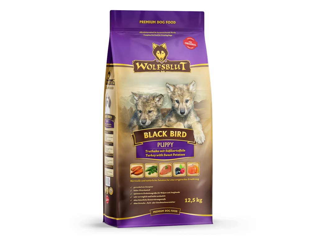 Vlci loví svou kořist ve Skalistých horách Severní Ameriky, arktické tundře, horách a lesích Evropy a dokonce i v pouštích a stepích Střední Asie. Ty jim z obsahu žaludku kořisti poskytují maso a na živiny bohaté vnitřnosti, stejně jako zeleninu, ovoce, bobule, kořeny a byliny. Obiloviny zde nejsou zahrnuty. Takto vlk získává vitamíny, minerály, stopové prvky, enzymy a druhotné rostlinné látky, které potřebuje. Vzhledem k tomu, že vlk je předkem všech psů, je naše suché krmivo pro psy Wolfsblut založeno na přirozených stravovacích návycích vlka. Obsahuje dostatek masa nebo ryb v kombinaci se superpotravinami, které obsahují cenné ingredience – stejně jako v přírodě, ale bez obilovin. Náš výběr výjimečného masa a superpotravin bohatých na živiny je založen na vlčím prostředí a jeho rozmanité stravě. Wolfsblut nabízí každému psovi druhově vhodnou a přirozenou stravu a díky široké škále druhů si každý pes najde to, co snese. Receptura suchého krmiva BLACK BIRD PUPPY kombinuje stravu vlka s nejnovějšími vědeckými poznatky o správné výživě psů.