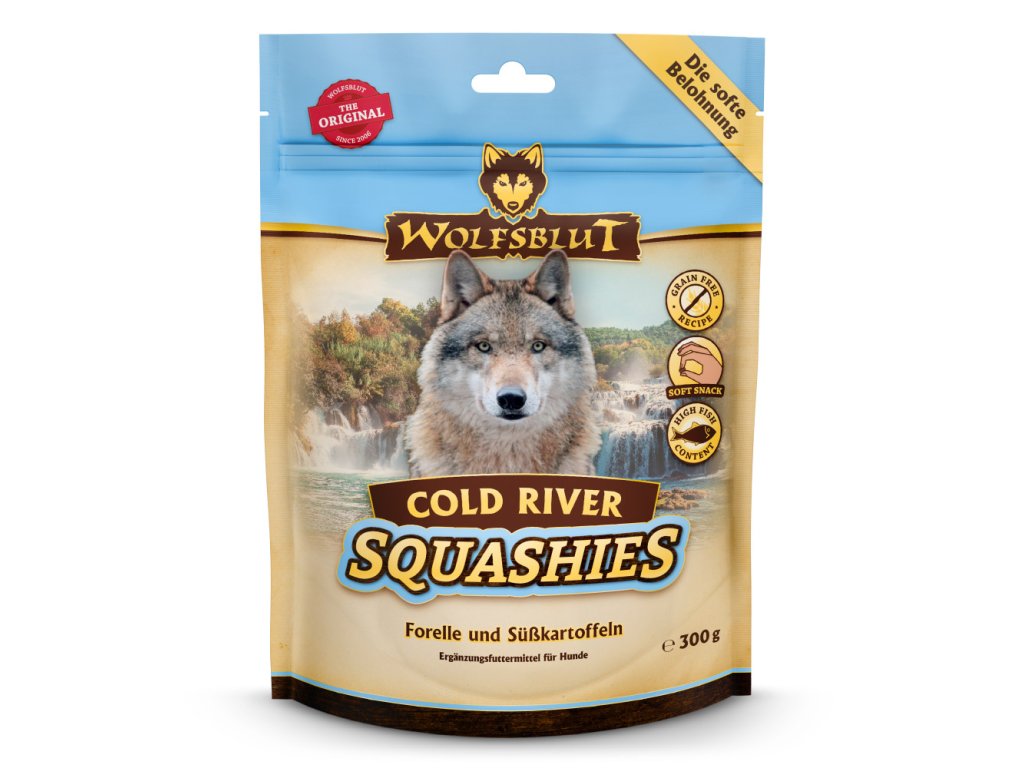 Cold River Squashies z Wolfsblut doplňují každodenní stravu vašeho psa. Jsou zdravou odměnou nebo malým jídlem na cesty. V kombinaci s krmivem pro vlčí krevní skupinu poskytují Cold River Squashies vašemu psovi všestranně zdravou a druhově vhodnou stravu. Všechny ingredience v této jedinečné kombinaci slouží k udržení zdraví vašeho chráněnce