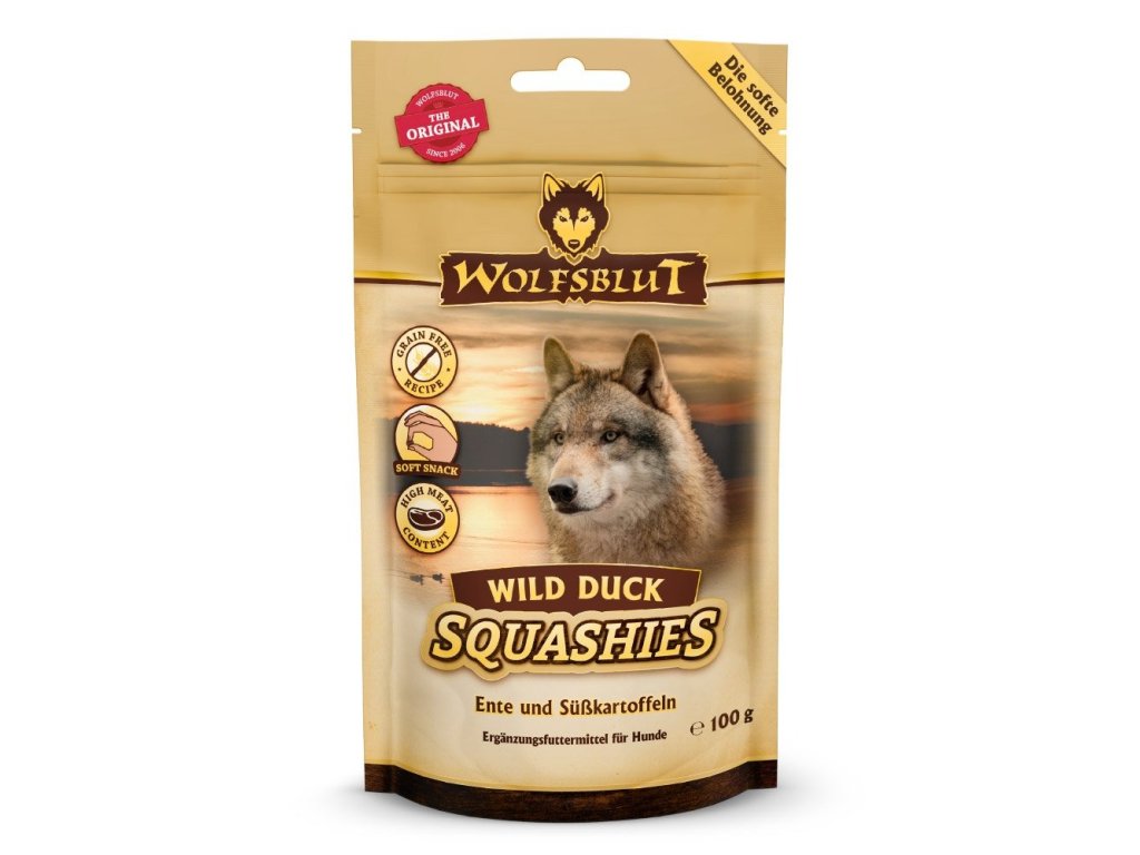 Wolfsblut Squashies jsou měkké psí svačiny bez obilovin a lepku s vysokým obsahem masa. Dýně také neobsahují žádný průmyslově vyráběný cukr, žádná barviva, vůně, atraktanty, plniva či konzervanty a žádné chemické antioxidanty.