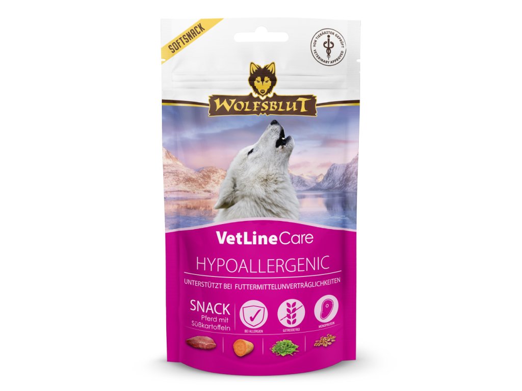 VetLine HYPOALLERGENIC Měkký hypoalergenní snack s koňským masem, lněným semínkem a řasami pro mazlíčky s intolerancemi. Jemné složení bez obilovin a zbytečných přísad šetří zažívání a potěší i mlsné jazýčky.