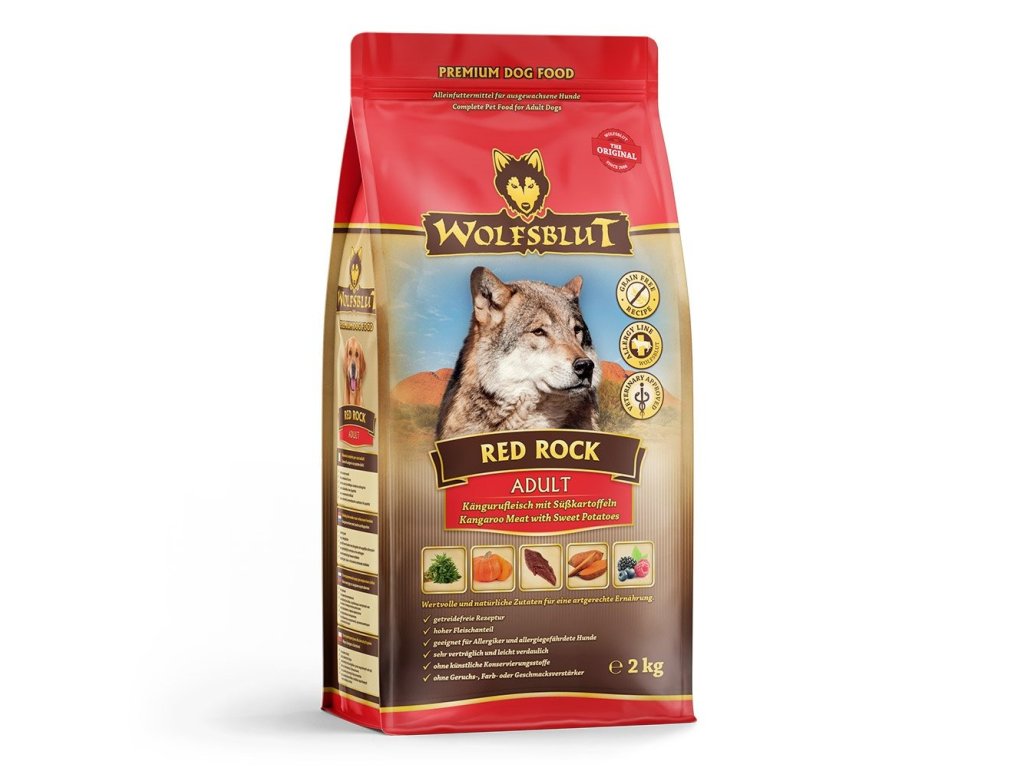 Vlci loví svou kořist od Skalistých hor Severní Ameriky, arktické tundry, hor a lesů Evropy až po pouště a stepi střední Asie. To jim dodává maso a vnitřnosti bohaté na živiny, ale také zeleninu, ovoce, bobule, kořeny a bylinky z obsahu žaludku kořisti. Obilí zde není zahrnuto. Vlk tak přijímá potřebné vitamíny, minerály, stopové prvky, enzymy a druhotné rostlinné látky. Vzhledem k tomu, že vlk je předkem všech psů, naše suché krmivo pro psy Wolfsblut je založeno na přirozených stravovacích návycích vlka. Obsahuje hodně masa nebo ryb v kombinaci se superpotravinami, které obsahují hodnotné ingredience – stejně jako v přírodě, bez obilovin. Náš výběr výjimečných druhů masa a superpotravin bohatých na živiny vychází z vlčích biotopů a jejich pestré stravy. Wolfsblut nabízí každému psovi druhově vhodnou a originální stravu a díky rozmanitosti odrůd si každý najde něco, co snese. Receptura na suché krmivo RED ROCK ADULT kombinuje výživu vlků s nejnovějšími vědeckými poznatky o správné výživě psů.