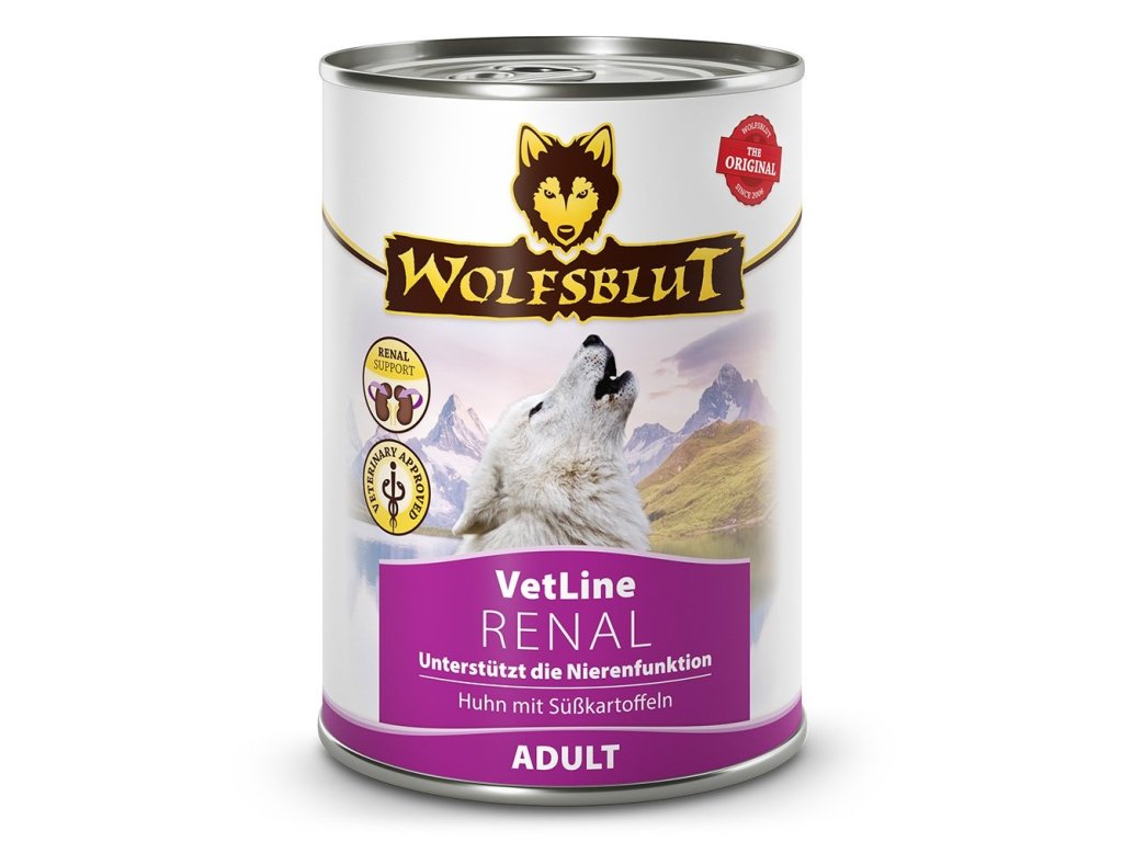 WOLFSBLUT VetLine RENAL je kompletní dietní krmivo pro dospělé psy pro podporu funkce ledvin při chronickém selhání ledvin a pro snížení tvorby oxalátových kamenů.