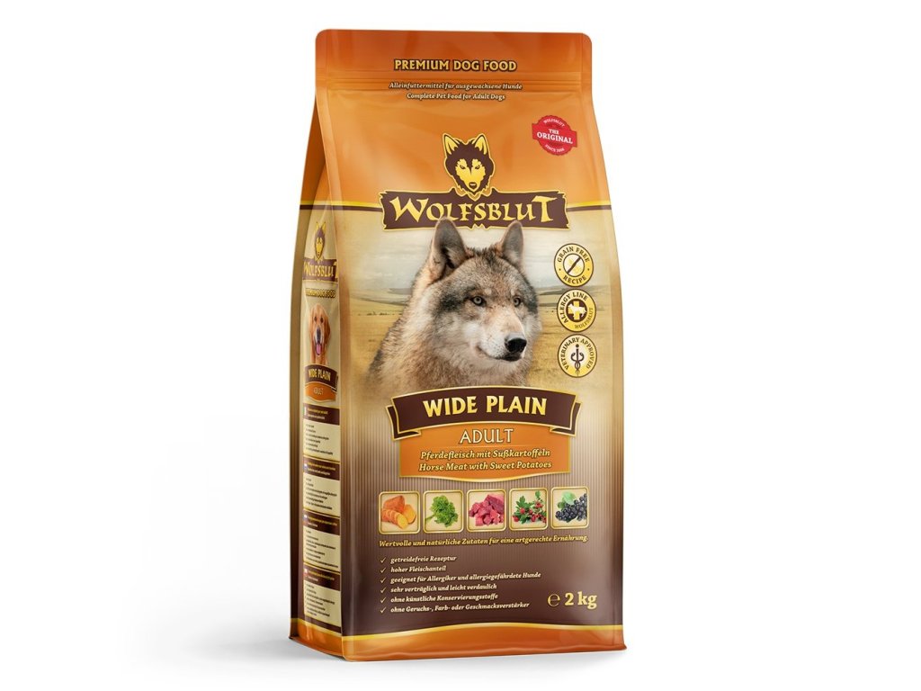 Vlci loví svou kořist od Skalistých hor Severní Ameriky, arktické tundry, hor a lesů Evropy až po pouště a stepi střední Asie. To jim dodává maso a vnitřnosti bohaté na živiny, ale také zeleninu, ovoce, bobule, kořeny a bylinky z obsahu žaludku kořisti. Obilí zde není zahrnuto. Vlk tak přijímá potřebné vitamíny, minerály, stopové prvky, enzymy a druhotné rostlinné látky. Vzhledem k tomu, že vlk je předkem všech psů, naše suché krmivo pro psy Wolfsblut je založeno na přirozených stravovacích návycích vlka. Obsahuje hodně masa v kombinaci se superpotravinami, které obsahují hodnotné ingredience – stejně jako v přírodě, bez jakýchkoliv obilovin. Náš výběr výjimečných druhů masa a superpotravin bohatých na živiny vychází z vlčích biotopů a jejich pestré stravy. Wolfsblut nabízí každému psovi druhově vhodnou a originální stravu a díky rozmanitosti odrůd si každý najde něco, co snese. Tato receptura byla vyvinuta ve spolupráci s veterináři a je založena na přirozeném vzoru vlčí kořisti. S bohatými sladkými bramborami jako bezlepkovým zdrojem sacharidů je váš pes také vybaven cennou vlákninou a beta-karotenem.
