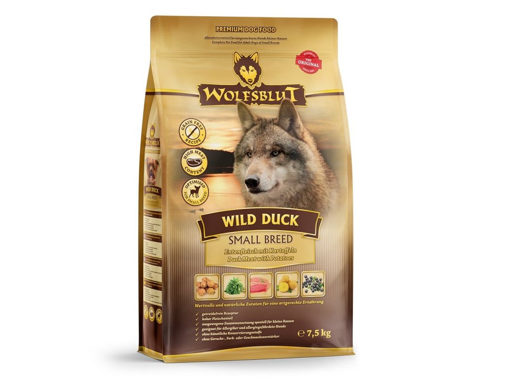 Vlci loví svou kořist od Skalistých hor Severní Ameriky, arktické tundry, hor a lesů Evropy až po pouště a stepi střední Asie. To jim dodává maso a vnitřnosti bohaté na živiny, ale také zeleninu, ovoce, bobule, kořeny a bylinky z obsahu žaludku kořisti. Obilí zde není zahrnuto. Vlk tak přijímá potřebné vitamíny, minerály, stopové prvky, enzymy a druhotné rostlinné látky. Vzhledem k tomu, že vlk je předkem všech psů, naše suché krmivo pro psy Wolfsblut je založeno na přirozených stravovacích návycích vlka. Obsahuje hodně masa nebo ryb v kombinaci se superpotravinami, které obsahují hodnotné ingredience – stejně jako v přírodě, bez obilovin. Náš výběr výjimečných druhů masa a superpotravin bohatých na živiny vychází z vlčích biotopů a jejich pestré stravy. Wolfsblut nabízí každému psovi druhově vhodnou a originální stravu a díky rozmanitosti odrůd si každý najde něco, co snese. Receptura na suché krmivo WILD DUCK SMALL BREED kombinuje výživu vlků s nejnovějšími vědeckými poznatky o správné výživě psů.