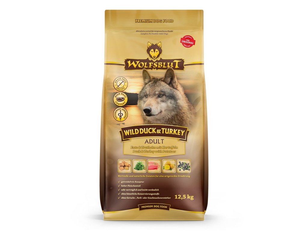 Vlci loví svou kořist od Skalistých hor Severní Ameriky, arktické tundry, hor a lesů Evropy až po pouště a stepi střední Asie. To jim dodává maso a vnitřnosti bohaté na živiny, ale také zeleninu, ovoce, bobule, kořeny a bylinky z obsahu žaludku kořisti. Obilí zde není zahrnuto. Vlk tak přijímá potřebné vitamíny, minerály, stopové prvky, enzymy a druhotné rostlinné látky. Vzhledem k tomu, že vlk je předkem všech psů, naše suché krmivo pro psy Wolfsblut je založeno na přirozených stravovacích návycích vlka. Obsahuje hodně masa nebo ryb v kombinaci se superpotravinami, které obsahují hodnotné ingredience – stejně jako v přírodě, bez obilovin. Náš výběr výjimečných druhů masa a superpotravin bohatých na živiny vychází z vlčích biotopů a jejich pestré stravy. Wolfsblut nabízí každému psovi druhově vhodnou a originální stravu a díky rozmanitosti odrůd si každý najde něco, co snese. Receptura suchého krmiva WILD DUCK & TURKEY kombinuje výživu vlků s nejnovějšími vědeckými poznatky o správné výživě psů.