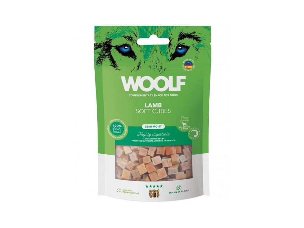 Woolf soft Cubes je pamlsek pro psy, který se může pochlubit charakteristickou polovlhkou texturou, odvozenou výhradně z přírodních ingrediencí. All-Natural: Tento termín označuje použití minimálně zpracovaných surovin bez jakýchkoli syntetických přísad, jako jsou barviva, příchutě nebo konzervační látky. Zcela přírodní pamlsky pro psy používají zdravé, rozpoznatelné složky běžně se vyskytující v přírodě, jako je pravé maso, zelenina, ovoce a obiloviny. Polovlhké: Polovlhké pamlsky pro psy slouží jako přechodná textura mezi suchými psími sušenkami a mokrým krmivem v konzervě. Jsou měkké, poddajné, lehce žvýkací a mají vyšší obsah vlhkosti než tradiční suché pamlsky, což psům usnadňuje jejich žvýkání a poskytuje chutnější zážitek.