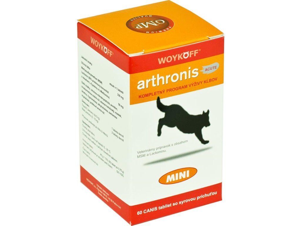 Použití ARTHRONIS ACUTE : při chronických bolestech svalů a kloubů, při poškození vazů, při nekvalitní srsti a drápech. Přípravek podávejte minimálně 1 měsíc, smí se však podávat i dlouhodobě do vymizení potíží psa. Arthronis ACUTE MINI má dávkování 1 tbl na 5 kg živé váhy psa, 1 tableta obsahuje 330 mg MSM a 50 mg lactominu. Užívání celé řady MINI je vhodné u malých psů max. do váhy 10 kg, nad kg již je vhodnější a levnější užívat velkou řadu Arthronis.