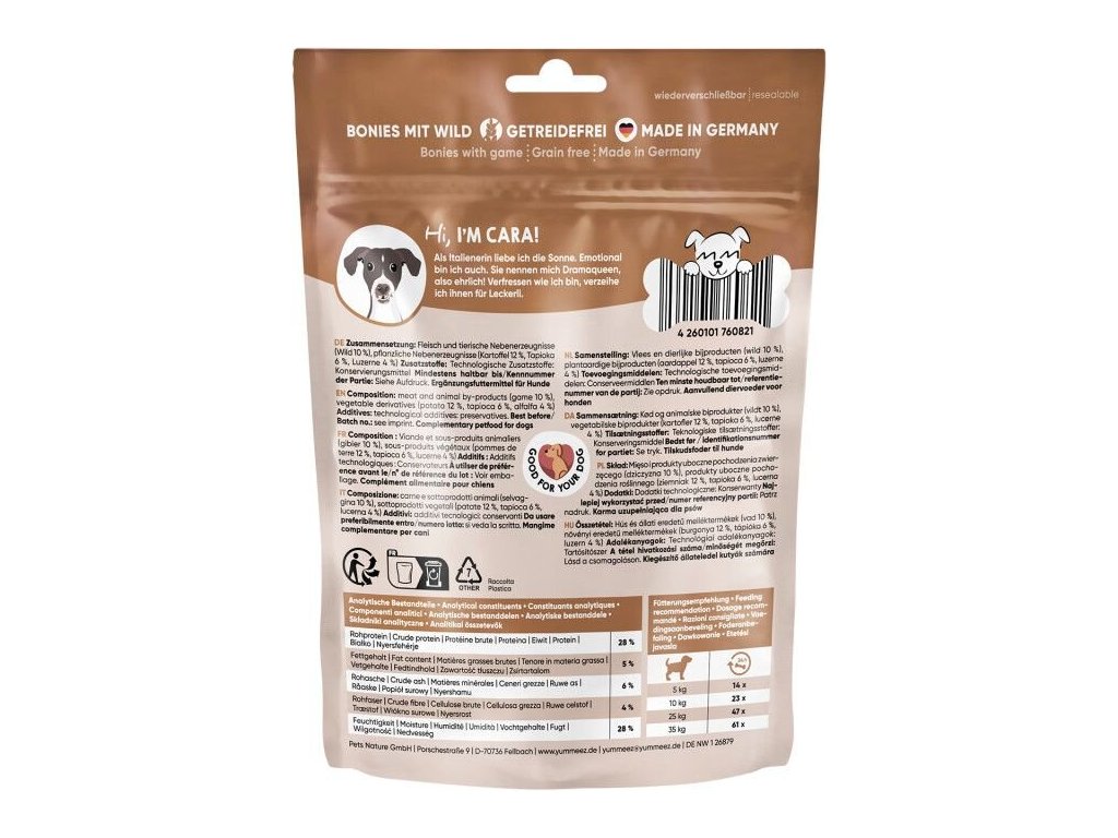 Poloměkké šťavnaté kostičky pro psy. Ideální při výcviku nebo jako chutná malá odměna.Yummeez neobsahují obiloviny, takže jsou vhodné i pro alergické psy. Kromě vysokého podílu masa obsahují také brambory, tapiocu (maniok jedlý) a zdravou vojtěšku.Sáček lze znovu uzavřít a pamlsky tak vydrží déle čerstvé.Složení: maso a živočišné vedlejší produkty (min. 10% zvěřina), rostlinné vedlejší produkty (min. 12% brambory, min. 6% tapioca, min. 4% vojtěška)Analýza: hrubé proteiny 28 %, hrubé oleje a tuky 5 %, hrubá vláknina 4 %, hrubé popeloviny 6 %, vlhkost 28 %Doplňkové látky: konzervační látkyYummeez jsou vyrobené v Německu.Podávejte jako odměnu. Zajistěte dostatek pitné vody. Určeno pro psy.