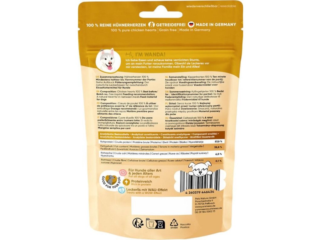 Pamlsky pro psy Yummeez Pure obsahují 100 % kuřecích srdíček – bez jakýchkoliv dalších příměsí. Proto jsou zvláště vhodné pro psy s potravinovými alergiemi a speciálními výživovými potřebami. Tyto čistě přírodní pamlsky milují i vybíraví čtyřnožci, protože díky speciálním výrobním postupům jsou Yummeez Pure zvláště chutné!