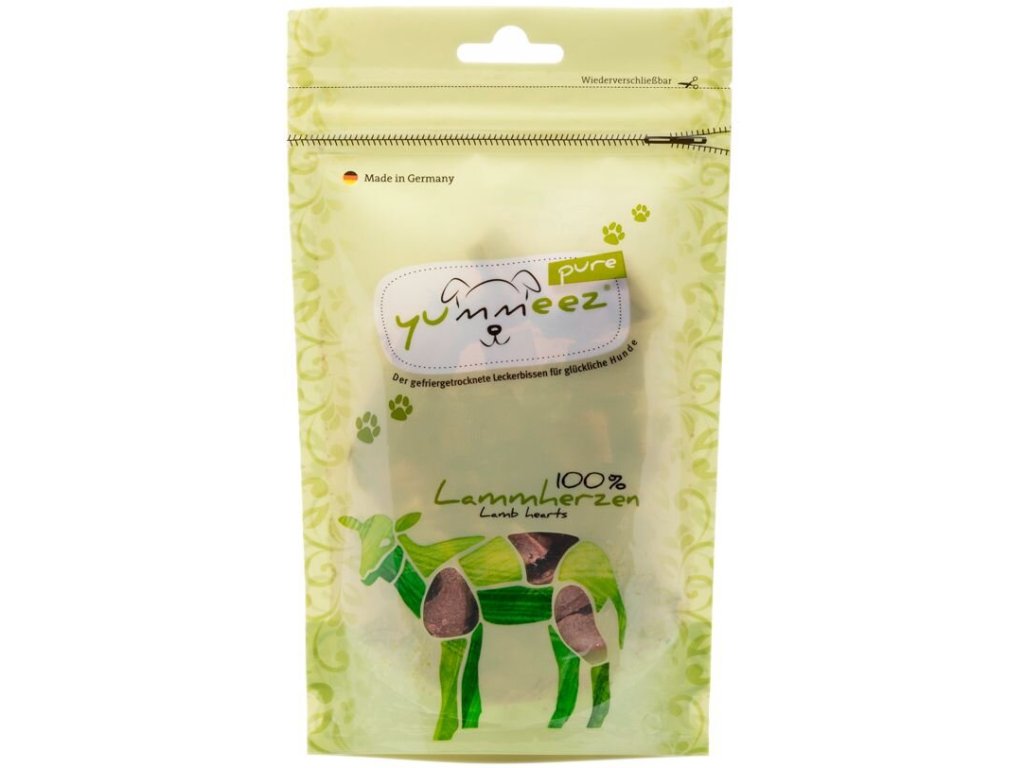 Yummeez Pure jsou čistě přírodní kousky mrazem sušeného masa pro psy s intenzivní chutí. Jsou skvělým způsobem jako motivovat psa při výcviku. Obsahují 100 % masa z jehněčích srdcí a jsou vynikající odměnou i pro vybíravé a na výživu citlivé pejsky.