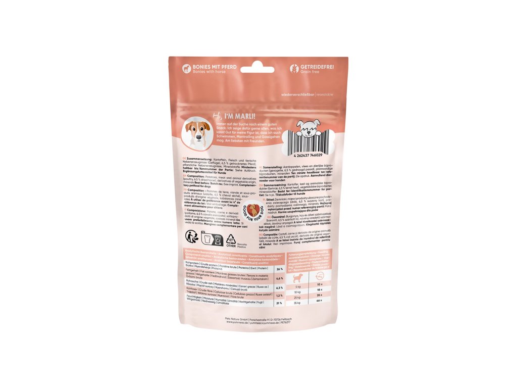 Složení: brambory, maso a vedlejší produkty živočišného původu (drůbež, 6,5 % sušený kůň), vedlejší rostlinné produkty, minerální látky