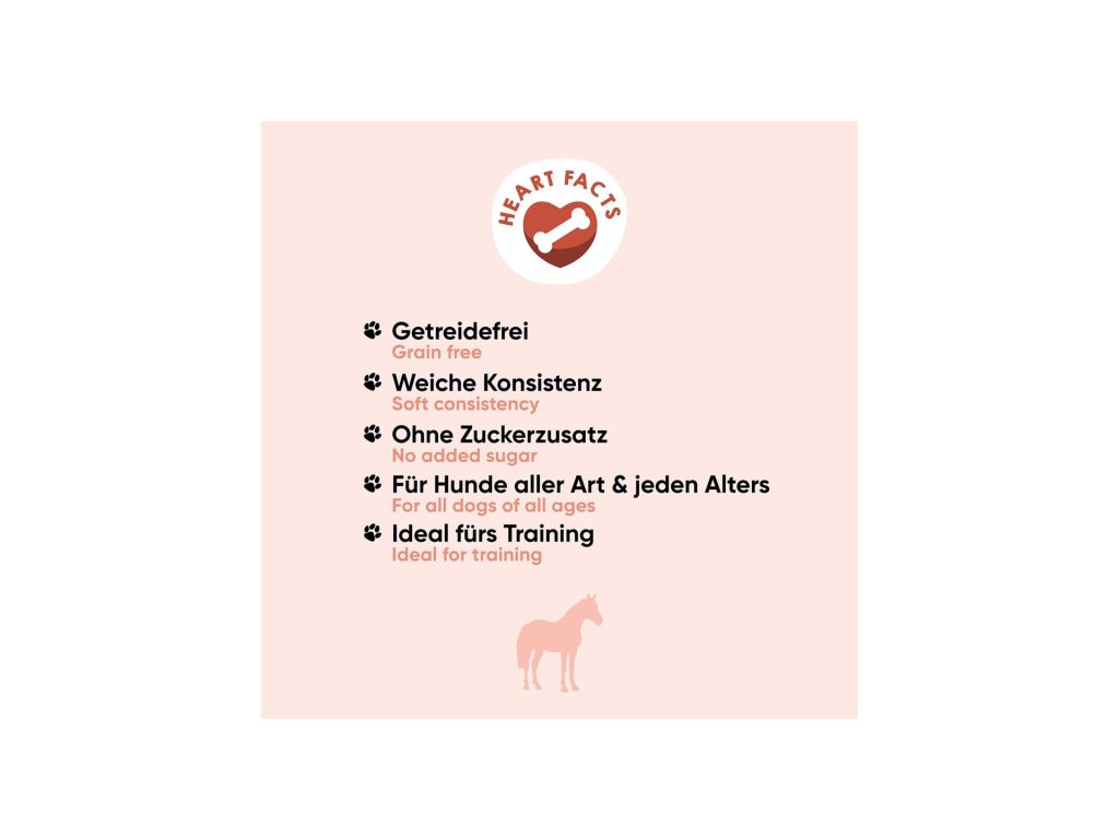 Měkké kostičky, které se snadno porcují – ideální odměna na trénink, procházky nebo výlety. Díky své vláčné konzistenci a drobným rozměrům si je oblíbí psi každé velikosti a všech věkových kategorií, včetně štěňat a seniorů.