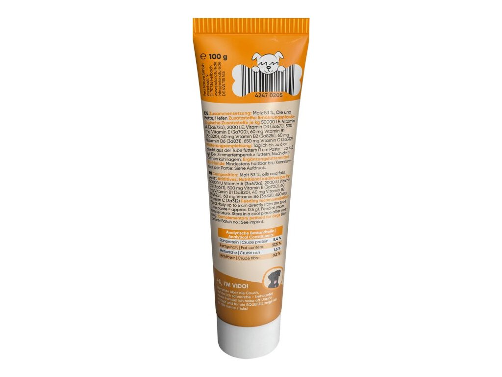 Tento krémový pamlsek je chutnou odměnou a zároveň zdravým doplňkem stravy. Obsahuje slad a kvasnice – přírodní zdroje trávicích enzymů a vlákniny, které podporují zdravé trávení a pravidelné vyprazdňování. Zároveň je obohacen o celou řadu vitamínů (A,B,C,D,E), které podporují celkové zdraví a vitalitu psa.