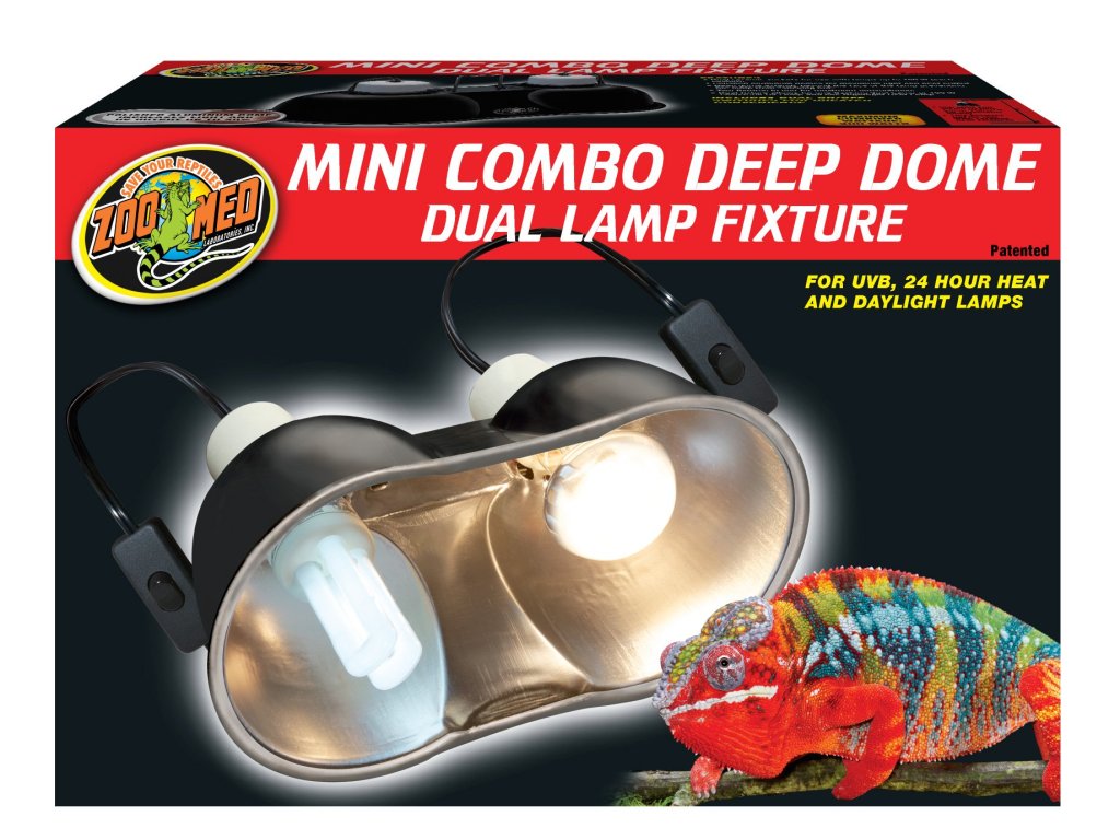 Mini lampa Combo Deep je určena pro terária, dvě lampy v jednom umožňují maximální pohodlí! Lampa umožňuje umístění výhřevné žárovky nebo UV osvětlení 100 W PowerSun a v druhé objímce noční výhřevné osvětlení. Leštěná hliníková kupole zvyšuje světelný a UV výkon až o 30 %. Dvě keramické zásuvky pro použití na žárovky až do 100 wattů (každá zásuvka). Hluboká kupole přesahuje žárovku, a tím zabraňuje trčení žárovky ven.